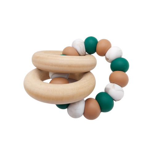 This gender-neutral Green Coffee Cup Rattle Ring is the perfect toy for babies who are teething. It is crafted with silicone beads and features two wooden rings that create a soft, rattling sound when shaken. The green beads are sure to capture your little one's attention.