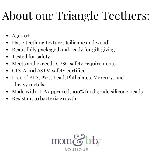 Our triangle teething toys are a must have for all teething babies. Featuring 2 teething textures, the soft silicone provides a chewy surface, while the wooden beads are perfect for when your little one needs a harder surface to help their teeth pop through.